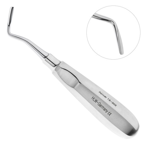 Изогнутый элеватор Apical 13-302 производства HLW применяется для удаления зубов, а также их корней из нижней челюсти. Этот инструмент применяется, когда коронковую часть сложно захватить щипцами. Ширина рабочей части элеватора Apical 13-302 составляет 3 мм, позволяя легко вводить его в лунку с минимальным травмированием. Ручка со специальными выемками легко удерживается, снижая нагрузку при работе.